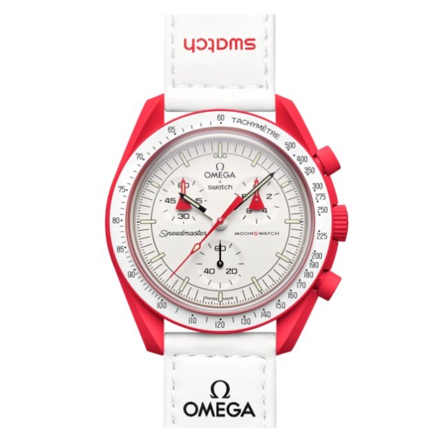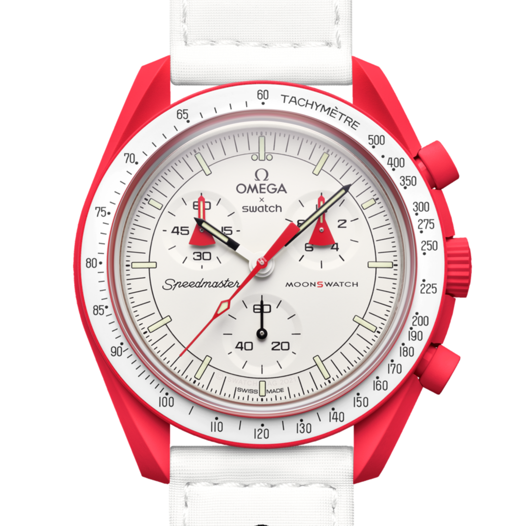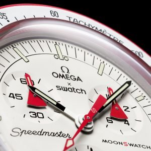 The MoonSwatch collection consists of eleven models, each named after a celestial body in our solar system, from the Sun to the dwarf planet Pluto. These watches feature the asymmetrical case, the famous “dot over ninety” on the tachymeter scale, and the distinctive Speedmaster subdials that are hallmarks of the legendary Omega Speedmaster Moonwatch.