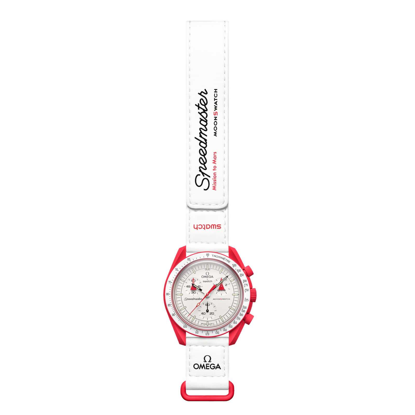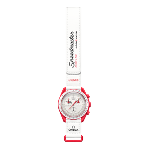The dials of these watches feature the Omega X Swatch branding, the iconic Speedmaster logo, and the new MoonSwatch logo. A closer look at the domed biosourced glass construction reveals the “hidden” ‘S’ integrated in the center of the crystal. The circular pattern on the dial’s outer ring and recessed subdials brings a refined touch to the design, complementing the sharp and smooth lugs construction. The hands and hour markers are coated with Super-LumiNova®, ensuring a perfect glow in the dark.